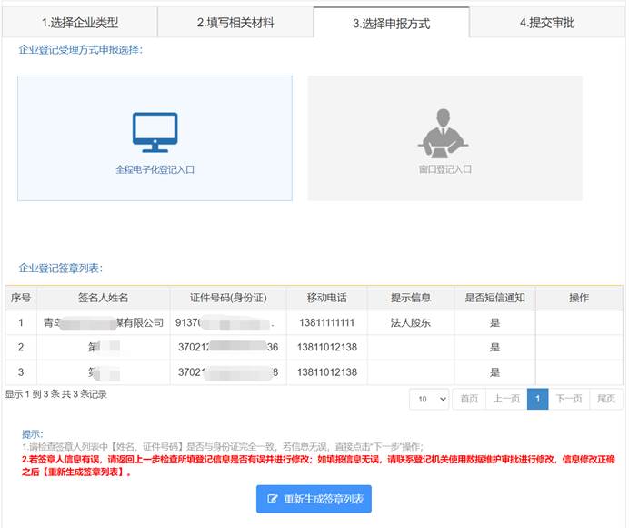 1、系统自动生成签名人列表。在申报方式页面,选择“全程电子化登记入口”,系统将自动生成签名人列表,签名人列表原则上不允许企业进行修改(例外情形:签名人为境外人员或企业的,仍允许修改签名人内容)。