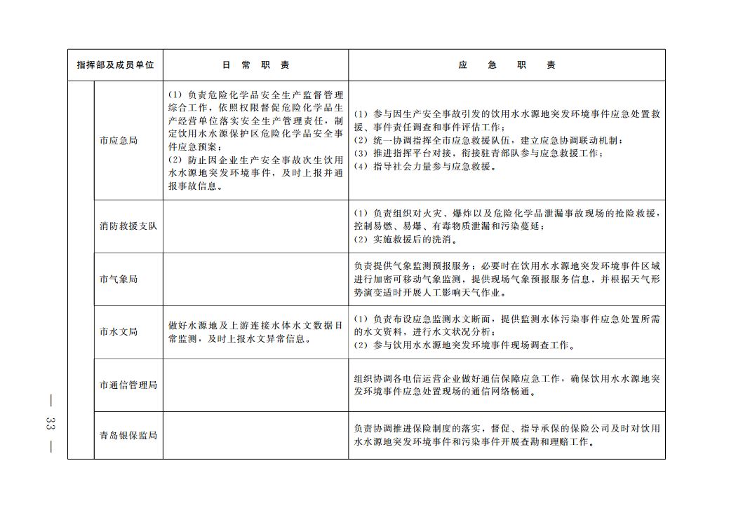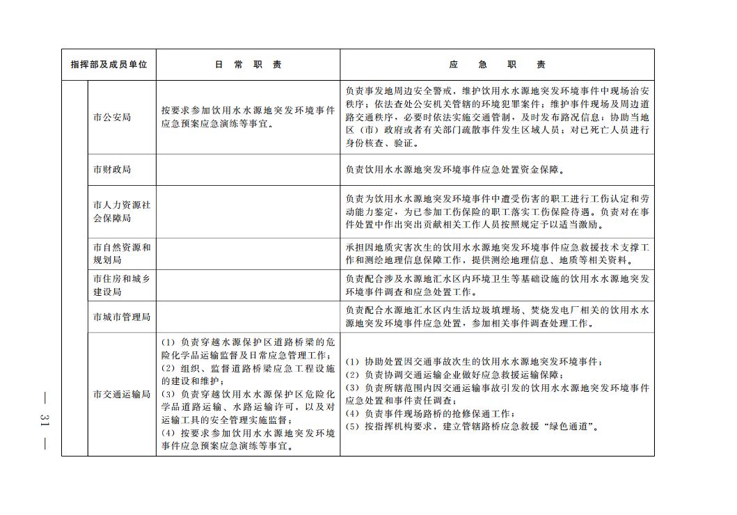 成立365bet365_bet28365365娱乐场_365体育网页版在线登录官网市集中式地表水饮用水水源地突发环境事件应急指挥部(以下简称市指挥部),由市政府分管副市长任总指挥,市政府分管副秘书长、市生态环境局局长任副总指挥。成员单位包括市生态环境局、市委宣传部、市委网信办、市发展改革委、市公安局、市财政局、市人力资源社会保障局、市自然资源和规划局、市住房城乡建设局、市城市管理局、市交通运输局、市水务管理局、市农业农村局、市卫生健康委、市应急局、消防救援支队、市气象局、市水文局、市通信管理局、365bet365_bet28365365娱乐场_365体育网页版在线登录官网银保监局、省调水工程运行维护中心365bet365_bet28365365娱乐场_365体育网页版在线登录官网分中心、365bet365_bet28365365娱乐场_365体育网页版在线登录官网水务集团有限公司。有关职责详见附件。