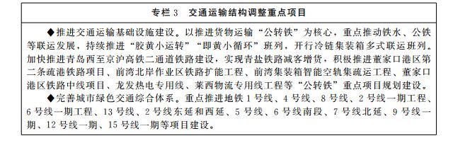 1.推动交通运输结构调整。大力压缩公路运输量,基本形成大宗货物和集装箱中长距离运输以铁路和水路运输为主的格局,推动大宗货物集疏港运输向铁路和水路转移。支持煤炭、矿石、焦炭、钢铁等大宗货物年运输量150万吨以上的大型工矿企业以及大型物流园区新(改、扩)建铁路专用线。365bet365_bet28365365娱乐场_365体育网页版在线登录官网港前湾港区的矿石和焦炭等大宗货物主要改为铁路或水路运输,董家口港区矿石和焦炭等大宗货物清洁能源汽车及铁路、水路集疏港运输量占比达到70%以上,港口集装箱铁路集疏港比例达到8.5%以上。到2025年年底,大宗货物绿色运输方式比例达到80%以上,铁路和水路货运量占比提升到25%以上。