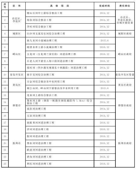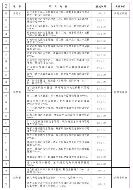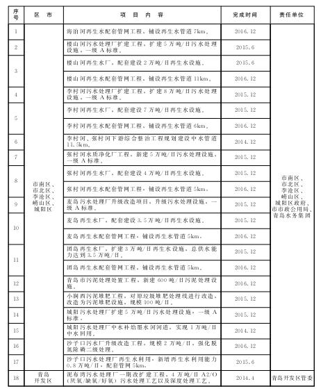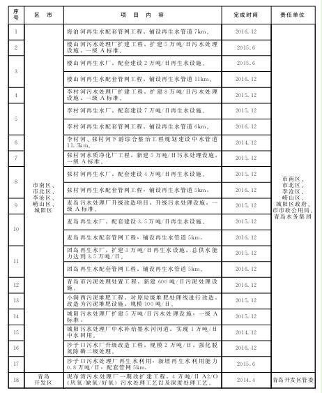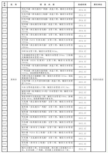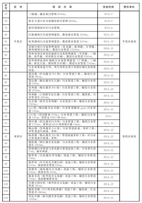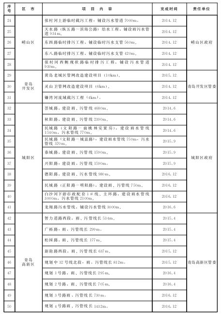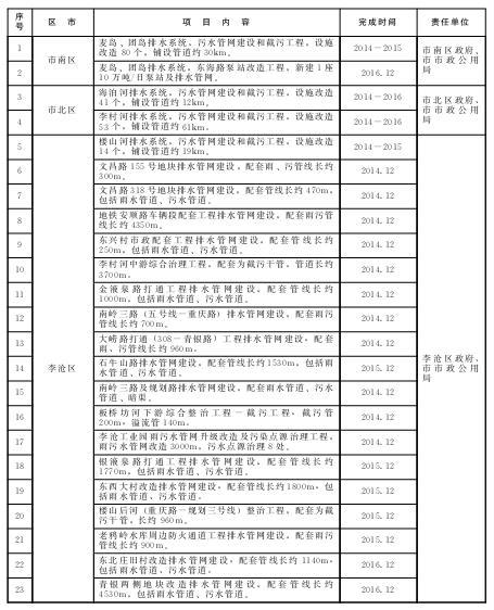 (一)整治污水直排口,2014年消除建成区污水直排现象。按照“实现雨污分流、污水纳管、排放达标”的基本原则制定整治方案,逐级分区落实治理责任,实行“零容忍”的目标管理制度,到2014年底,全面完成158处污水直排口整治任务,并实行动态监管,发现一处彻底解决一处。其中市南区、市北区、李沧区完成62处,需市区两级财力安排投资2000万元,主要用于排污口及周边环境综合整治。
