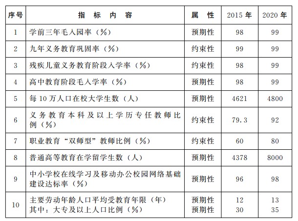 (三)发展目标。到2020年,实现高水平、有特色的教育现代化,基本建成学习型社会,形成区域性优势明显的人力资源集聚高地,教育事业发展主要指标和人力资源开发水平位居全国同类城市前列。