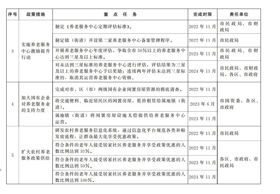 7落实国务院《养老托育服务业纾困扶持若干政策措施》要求,加大国有经济对养老服务业发展的引领和支持力度。推进国有经济在养老基础设施领域布局,为养老服务业健康发展提供有力支撑。对市、区(市)两级国有企业闲置的房屋资源进行摸底清查,鼓励国有企业优先将交通便利、临近居民区的闲置房屋低价租赁给属地镇(街道),由镇(街道)将房屋设施无偿提供给养老服务组织运营养老服务中心或养老服务站。