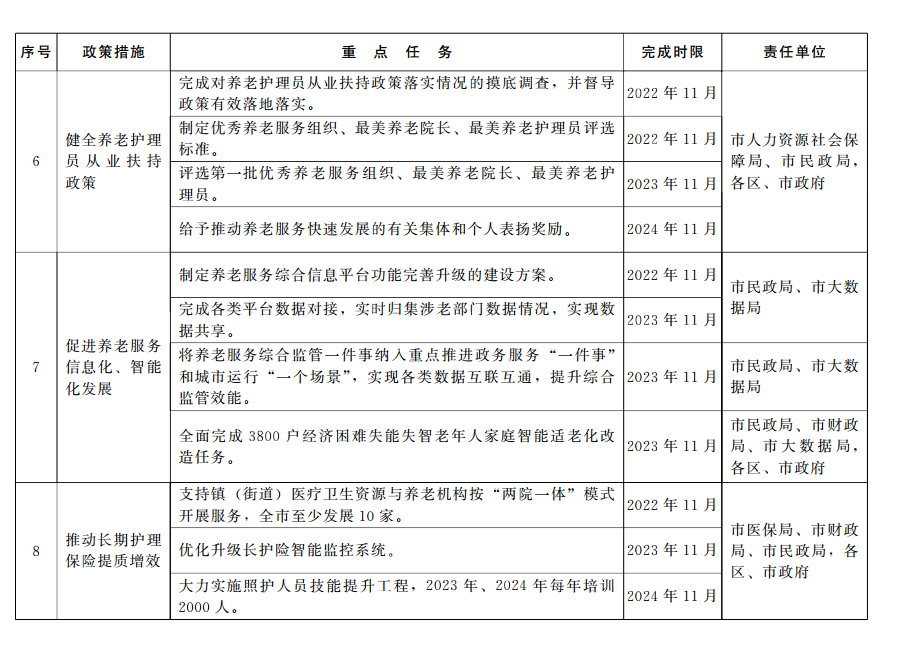11推动长期护理保险提标扩面、提质增效,城乡统筹、精细管理,更好满足群众需求。推动长期护理保险向农村扩展,支持镇(街道)医疗卫生资源与养老机构按“两院一体”模式开展服务,进一步提高农村照护服务的可及性。大力实施照护人员技能提升工程,2023年、2024年每年培训2000人,全面提升照护人员服务能力和服务质量。优化升级长期护理险智能监控系统,加强对长期护理机构服务的全过程监管,进一步提高参保人的获得感、幸福感和安全感。
