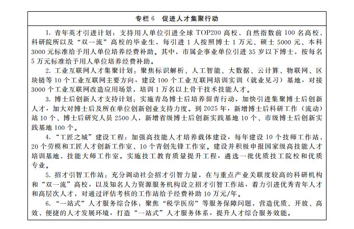 建设人才荟萃的青春之岛。人才发展与城市战略及产业布局同步推进、深度融合,人才治理体系更加完善,发展生态更加优越,国际化水平显着提升,竞争优势明显增强。集聚效应充分释放,全市人才总量突破300万人。