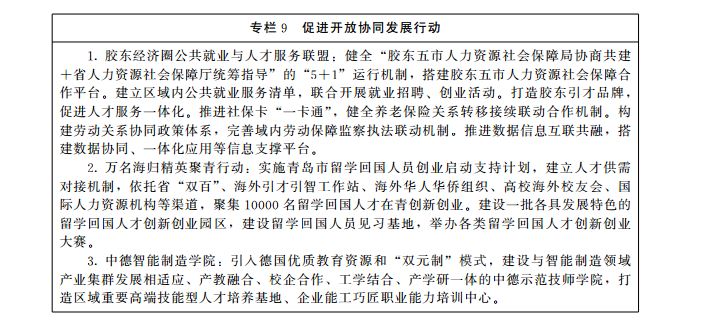 (二)促进形成区域协同发展新优势。主动对接京津冀、粤港澳、长三角等区域优质人才和创新创业要素资源,强化沿黄流域人力资源协同开放。深化胶东经济圈人社一体化发展,纵深推进公共就业与人才服务联盟建设,搭建胶东经济圈就业创业协同共建、人才人事携手共赢、社会保障便利共享、劳动关系联手共治、信息数据联动支撑、改革创新试点落地等一体化合作新机制新平台。