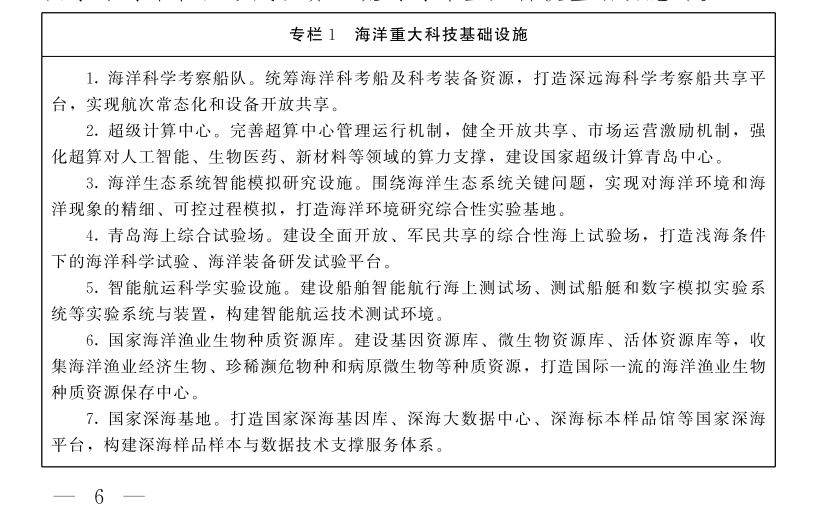 7.国家深海基地。打造国家深海基因库、深海大数据中心、深海标本样品馆等国家深海平台,构建深海样品样本与数据技术支撑服务体系。(三)建设海洋高端创新平台