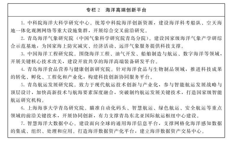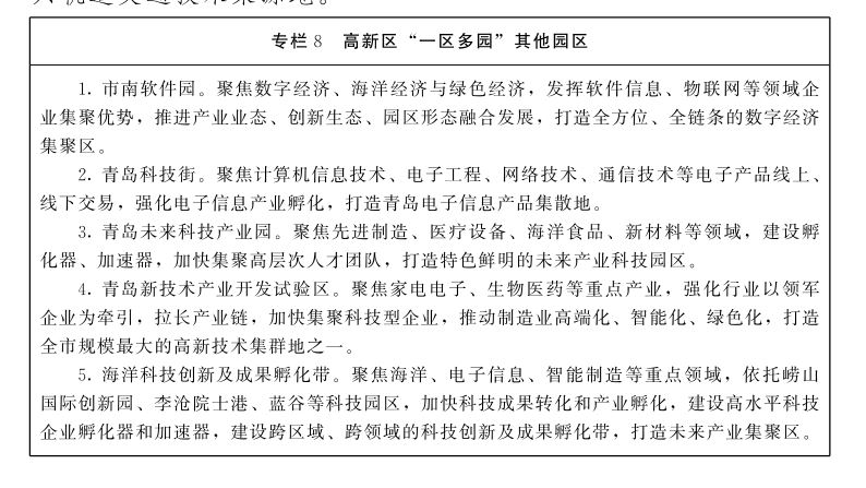 5.海洋科技创新及成果孵化带。聚焦海洋、电子信息、智能制造等重点领域,依托崂山国际创新园、李沧院士港、蓝谷等科技园区,加快科技成果转化和产业孵化,建设高水平科技企业孵化器和加速器,建设跨区域、跨领域的科技创新及成果孵化带,打造未来产业集聚区。