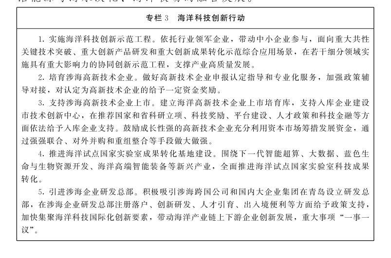 6.海水利用和海洋新能源。聚焦海水淡化核心技术,突破反渗透膜及组件、能量回收装置、高压泵等关键技术,开发大型成套海水淡化装备,提升区域海水淡化供给能力。开展海上风电装备、海洋新能源装备、微藻生物质能等技术研发,推进海洋清洁能源与海水淡化、海洋牧场的融合发展。专栏3海洋科技创新行动1.实施海洋科技创新示范工程。依托行业领军企业,带动中小企业参与,面向重大共性关键技术突破、重大创新产品研发和重大创新成果转化示范综合应用场景,在若干细分领域实施具有重大影响力的协同创新示范工程,支撑产业高质量发展。