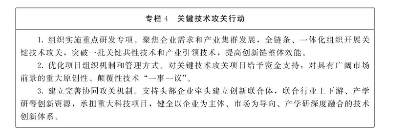 专栏4关键技术攻关行动1.组织实施重点研发专项。聚焦企业需求和产业集群发展,全链条、一体化组织开展关键技术攻关,突破一批关键共性技术和产业引领技术,提高创新链整体效能。