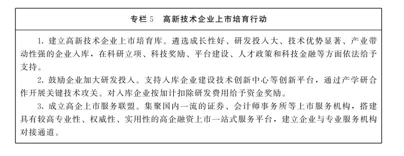 1.深化高新技术企业上市培育。实施高新技术企业上市培育行动,加强对高新技术企业服务指导,建立动态管理的上市培育库,“一企一专班”做好服务,搭建“发现一批、服务一批、推出一批”的高新技术企业上市培育机制,逐步形成良好有序的企业发展梯队。强化对拟上市高新技术企业精准扶持,支持企业与科创板、创业板、主板等多层次资本市场有效对接、做优做强,成为爆发式成长、竞争力突出的高科技头部企业。到2025年,上市高新技术企业总数达到50家。专栏5高新技术企业上市培育行动1.建立高新技术企业上市培育库。遴选成长性好、研发投入大、技术优势显着、产业带动性强的企业入库,在科研立项、科技奖励、平台建设、人才政策和科技金融等方面依法给予支持。