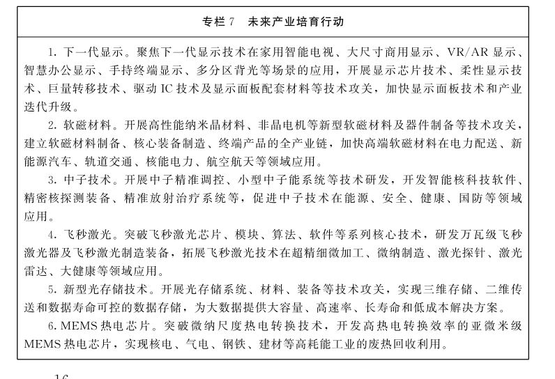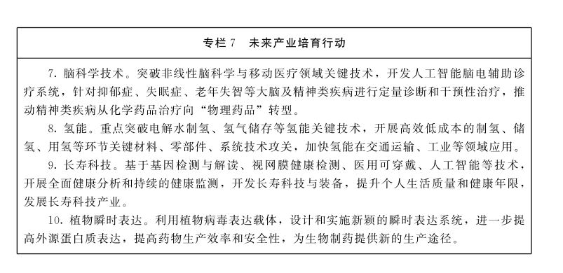 6.MEMS热电芯片。突破微纳尺度热电转换技术,开发高热电转换效率的亚微米级MEMS热电芯片,实现核电、气电、钢铁、建材等高耗能工业的废热回收利用。专栏7未来产业培育行动7.脑科学技术。突破非线性脑科学与移动医疗领域关键技术,开发人工智能脑电辅助诊疗系统,针对抑郁症、失眠症、老年失智等大脑及精神类疾病进行定量诊断和干预性治疗,推动精神类疾病从化学药品治疗向“物理药品”转型。