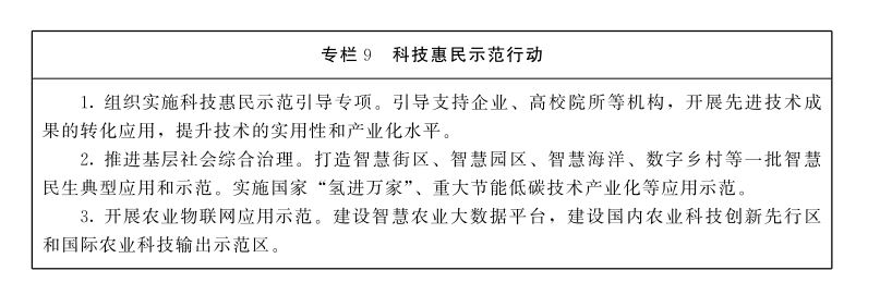 2.推进基层社会综合治理。打造智慧街区、智慧园区、智慧海洋、数字乡村等一批智慧民生典型应用和示范。实施国家“氢进万家”、重大节能低碳技术产业化等应用示范。