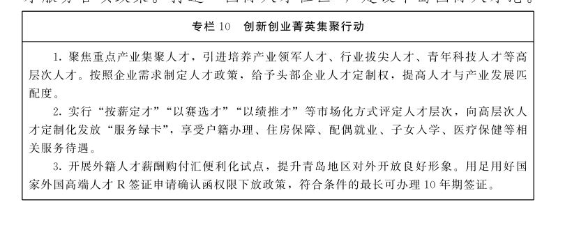 3.提升人才服务水平。建立人才服务大数据平台,统筹落实好税收优惠、子女教育、医疗保健、住房保障、交通出行等人才服务各项政策。打造“国际人才社区”,建设半岛国际人才港。专栏10创新创业菁英集聚行动1.聚焦重点产业集聚人才,引进培养产业领军人才、行业拔尖人才、青年科技人才等高层次人才。按照企业需求制定人才政策,给予头部企业人才定制权,提高人才与产业发展匹配度。