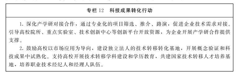 2.鼓励高校以市场应用为导向,建设独立法人的技术转移转化基地,开展概念验证和科技成果中试熟化。支持高校开展技术转移学科建设和学历教育,共建国家技术转移人才培养基地,培养职业技术经纪人和经理人队伍。