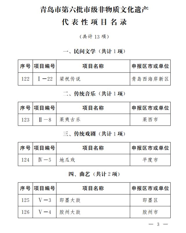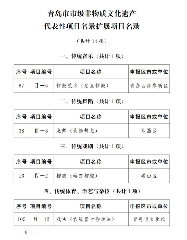 市政府批准市文化和旅游局确定的第六批市级非物质文化遗产代表性项目名录(共计13项)和市级非物质文化遗产代表性项目名录扩展项目名录(共计14项),现予公布。