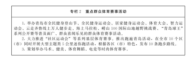 坚持政府主导、企业主体、协会参与、市场运作,彰显365bet365_bet28365365娱乐场_365体育网页版在线登录官网山、海、城特色,突出"运动365bet365_bet28365365娱乐场_365体育网页版在线登录官网、健康城市"主题,每月推出1个体育节庆活动,打造365bet365_bet28365365娱乐场_365体育网页版在线登录官网群众体育品牌,让市民天天想健身、节庆掀高潮、常年不断线。以"社区运动会"为龙头,"一区一品"为样板,打造市级10个以上、每区(市)5个以上不同层次和类型的公益性全民健身活动品牌,形成届次。依托节假日,大力组织开展健康跑、健步行、骑行、登山、游泳、球类、广场舞等群众性体育赛事活动,街道(镇)每年举办4次以上、村(社区)每年举办2次以上群众体育赛事活动。办好冰雪节,推广群众冰雪运动。到2025年全市经常参加体育锻炼人数比例达到50%,每年市级全民健身活动不少于90项,区(市)级不少于300项,参与人数超过2000万人次。