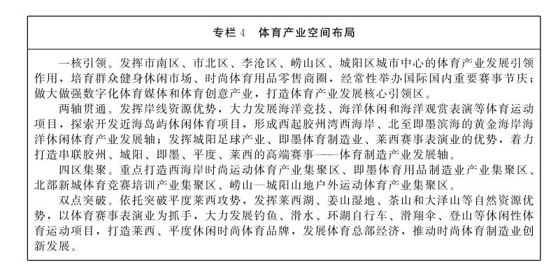 统筹"一核引领、两轴贯通、四区集聚、双点突破"的体育产业发展空间格局,贯通胶州、城阳、即墨、平度、莱西体育制造产业发展轴,建设涵盖健身器械、竞赛用品、运动护具、运动服饰、户外运动休闲用品等产品的生产销售集散地;依托雄厚的体育制造业基础,打造即墨高端体育健身器械制造产业集聚区;引进国际国内知名体育制造企业,发挥其技术和资金优势,支持组建相关产业联盟,锻长板、补短板,集中布局、集约发展,延长上下游产业链,壮大区域性集约发展优势和产业规模。