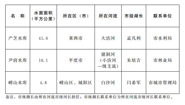 (一)组织形式。湖长体系设置与各级河长设置充分结合,原则上各级湖长由本条河流上相应的各级河长担任,全面建立市、区(市)、镇(街道)、村(社区)四级湖长体系。省级重要河流大沽河上的产芝水库、市级重要河流小沽河上的尹府水库、跨行政区域的位于白沙河上游的崂山水库,设立市级湖长。其他的湖泊湖长设置由相关区(市)、镇(街道)、村(社区)分别确定,其中,跨行政区域的湖泊,原则上由上一级负责同志担任湖长。各类湖泊所在区(市)、镇(街道)、村(社区)按照行政区域分级设立湖长,实行网格化管理,确保湖泊所有水域都有明确的责任主体。已经设立河长的湖泊、水库和湿地,按要求抓紧完善湖长体系,名称统一为湖长;尚未设立河长的湖泊、水库和湿地,尽快建立湖长体系。