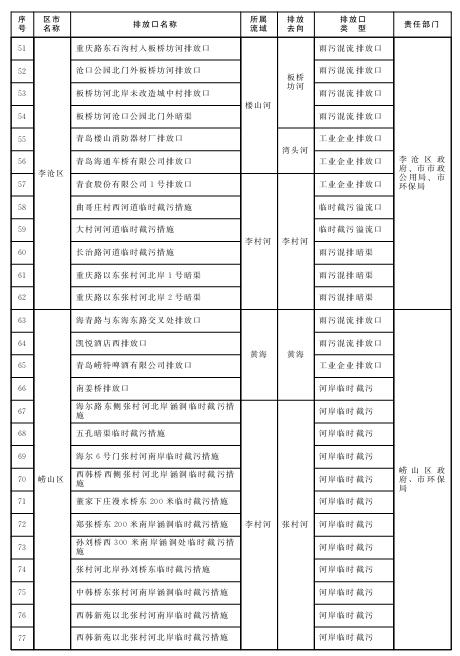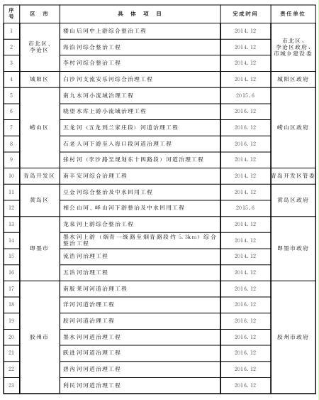 (二)目标要求。按照省委、省政府提出的解决城市(含县城)建成区污水直排环境问题的有关目标要求,以解决污水直排环境问题为重点,用3年时间全面实施全市河流污染整治工作。2014年,全面整治环胶州湾的污染河流;解决城区污水直排环境问题,消除所有污水直排口。到2016年底,全市范围内主要河流水质明显改善,鱼类可稳定生长;废水排放重点企业达标排放、100%实现远程监控;胶州湾污染隐患基本消除。