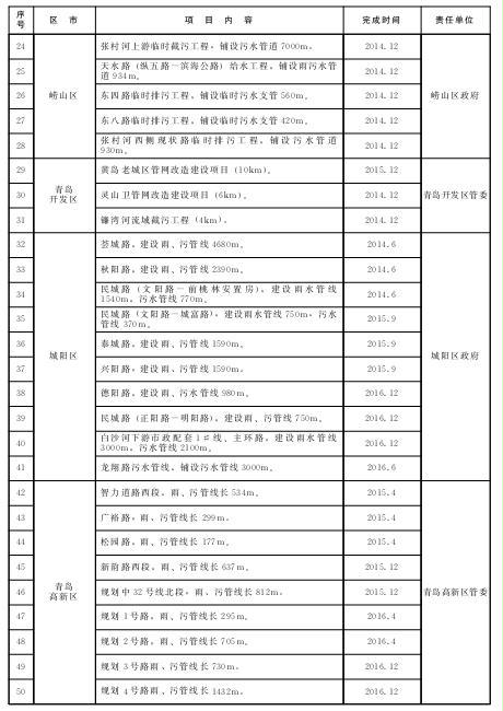 (一)整治污水直排口,2014年消除建成区污水直排现象。按照“实现雨污分流、污水纳管、排放达标”的基本原则制定整治方案,逐级分区落实治理责任,实行“零容忍”的目标管理制度,到2014年底,全面完成158处污水直排口整治任务,并实行动态监管,发现一处彻底解决一处。其中市南区、市北区、李沧区完成62处,需市区两级财力安排投资2000万元,主要用于排污口及周边环境综合整治。